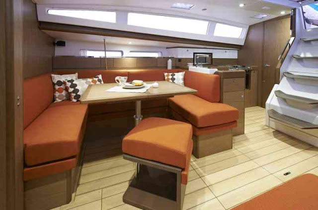 Recently Ive been looking at the new Sun Odyssey DS line of cruising yachts and had a chance to go aboard one of these uniquely styled boats at a recent boat show. In reviewing this design Ill start with the overall proportions of the boat because we can learn a lot about a boats sailing qualities just by assessing the juxtaposition of the keel, rig and hull volumes. Boats can be beautiful or not, but I think boats that perform well are always better looking than those that dont, regardless of dimensions and coefficients. In the profile view above, notice the relationships between the hull, keel and rig. The nearly vertical leading edge of the keel is slightly forward of the mast. On the deckplan youll see that there is a jib traveler also just forward of the mast along with a pair of jib tracks just aft of it, with the shrouds led to chainplates that are located almost at the gunwales. All of this dictates that the 41DS will carry small headsails, while the mainsail shown in the photos is a good looking fully battened and lazy-jacked unit with lots of power. This arrangement looks to me like it will generate a good deal of weather helm, so itll be interesting to take this boat out for a test sail.
